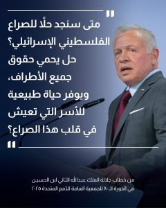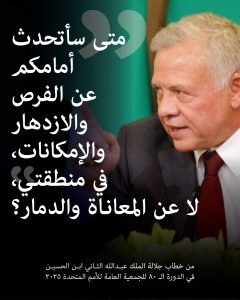 جوردن ديلي – ألقى جلالة الملك عبدالله الثاني، اليوم الثلاثاء، خطابا في الجلسة الافتتاحية لاجتماعات الجمعية العامة للأمم المتحدة في دورتها الثمانين المنعقدة بنيويورك، بحضور سمو الأمير الحسين بن عبدالله الثاني، ولي العهد، وسمو الأمير هاشم بن عبدالله الثاني.