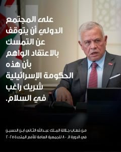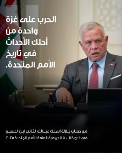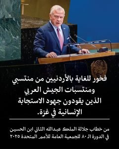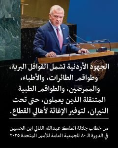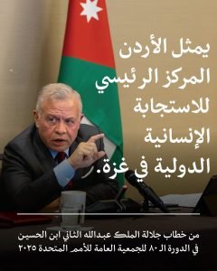 ويمثل الأردن المركز الرئيسي للاستجابة الإنسانية الدولية في غزة، ويعمل بكل الوسائل الممكنة لتوفير الإمدادات الحيوية من المساعدات والمواد الغذائية. ونقدر شركاءنا الإقليميين والدوليين، كما أنني فخور للغاية بالأردنيين، من منتسبي ومنتسبات القوات المسلحة الأردنية – الجيش العربي الذين يقودون هذه الجهود التي تشمل القوافل البرية، وطواقم الطائرات، والأطباء، والممرضين، والطواقم الطبية المتنقلة الذين يعملون، حتى تحت النيران، لتوفير الإغاثة لأهالي القطاع.