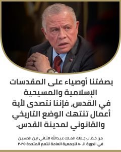 وبصفتنا أوصياء على المقدسات الإسلامية والمسيحية في القدس، فإننا نتصدى لأية أعمال تنتهك الوضع التاريخي والقانوني لمدينة القدس، فالعبث بالوضع الحساس في المدينة المقدسة سيتسبب بتفجير صراع عالمي.