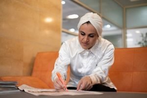 Safaa in her office using a newspaper as part of her daily journalistic work, Photo Credit: UNESCO